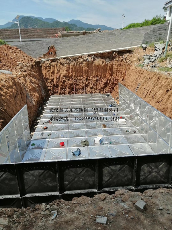 通過高強度螺絲將各塊模壓板安裝成型,水箱模板之間采用食品級硅膠條連接防漏水,此種硅膠條有遇水自動膨脹功能,防漏效果極佳。內部采用拉筋支撐,與水接觸的地方完全無焊接點,不產生腐蝕現象,從而延長水箱的使用壽命。